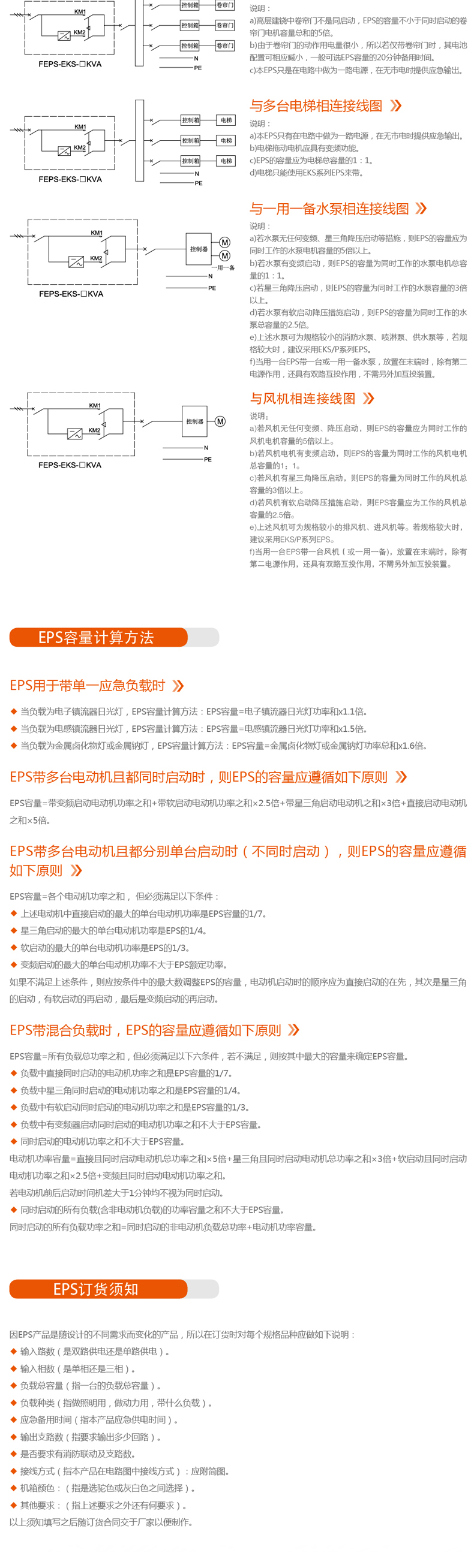 1、若電機(jī)均有變頻啟動(dòng)功能,則各負(fù)載容量總和與EPS容量的選配比為1:1