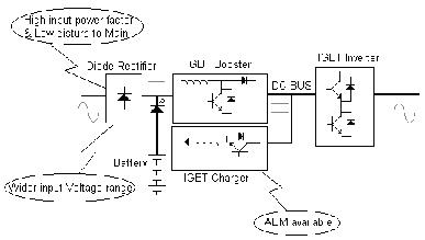 新型全I(xiàn)GBT UPS結(jié)構(gòu)(高頻機(jī))如下,基本結(jié)構(gòu):不控整流+DC/DC倍壓環(huán)節(jié)+獨(dú)立充電器+逆變器