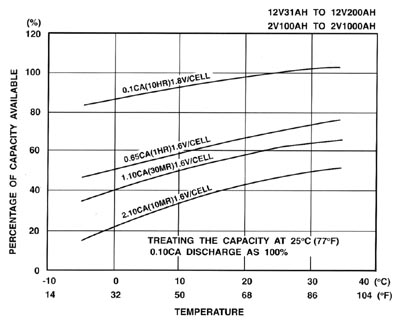 溫度對電池容量有顯著的影響,溫度降低,電池容量下降,請參考曲線圖。